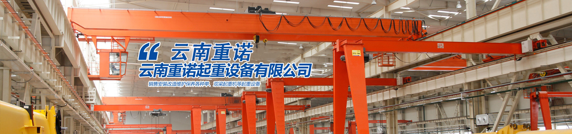 云南重諾起重設(shè)備有限公司主要經(jīng)營(yíng)銷售:橋式起重機(jī)、門式起重機(jī)、懸掛起重機(jī)、旋臂起重機(jī)、電動(dòng)葫蘆、升降貨梯、電動(dòng)平車、液壓升降平臺(tái)、升降搬運(yùn)設(shè)備、起重配套工具、起重軸承、起重機(jī)各部位配件。公司產(chǎn)品暢銷全國(guó)各地,深受用戶的信賴?! 」就ㄟ^(guò)了ISO9001 :2000質(zhì)量體系認(rèn)證具備320T及以下噸位橋式起重機(jī)、280T及以下噸位門式起重機(jī)特種設(shè)備制造許可證.320T及以下起重機(jī)的特種設(shè)備安裝......更多>>